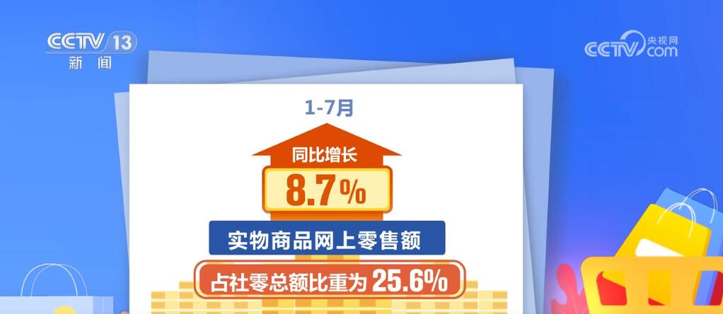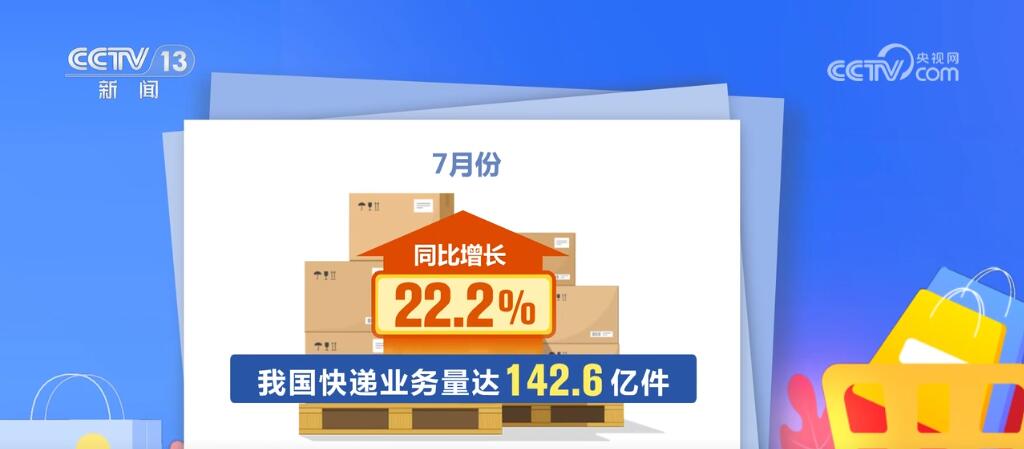 同時,線上消費增勢較好。1—7月,實物商品網上零售額同比增長8.7%,占社零總額比重為25.6%。7月份,我國快遞業務量達142.6億件,同比增長22.2%。