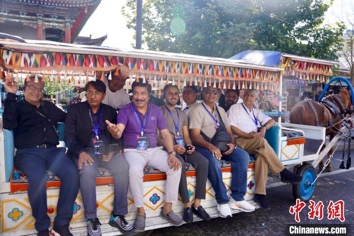22日,巴基斯坦媒體人乘坐街區特色的電驅動馬車,參觀游覽民族風情街。陳欣怡 攝