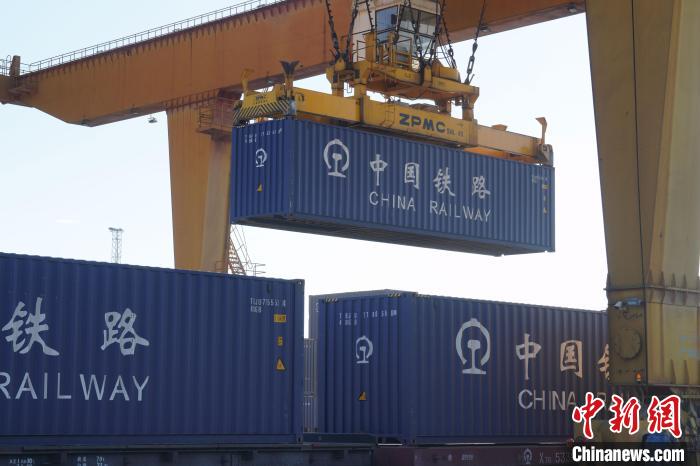 圖為龍門吊正將集裝箱從卡車轉(zhuǎn)移至中越貨運班列。 王以照 攝