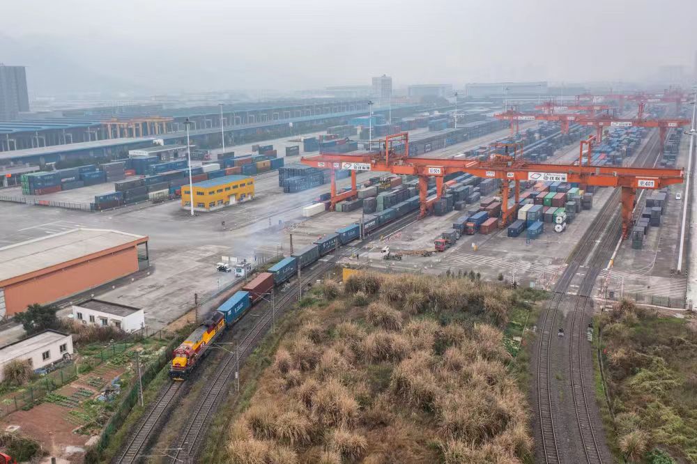 2024年3月7日,一列滿載機械設備、整車及零部件等貨物的西部陸海新通道鐵海聯運班列從重慶團結村中心站駛出(無人機照片)。新華社記者黃偉攝