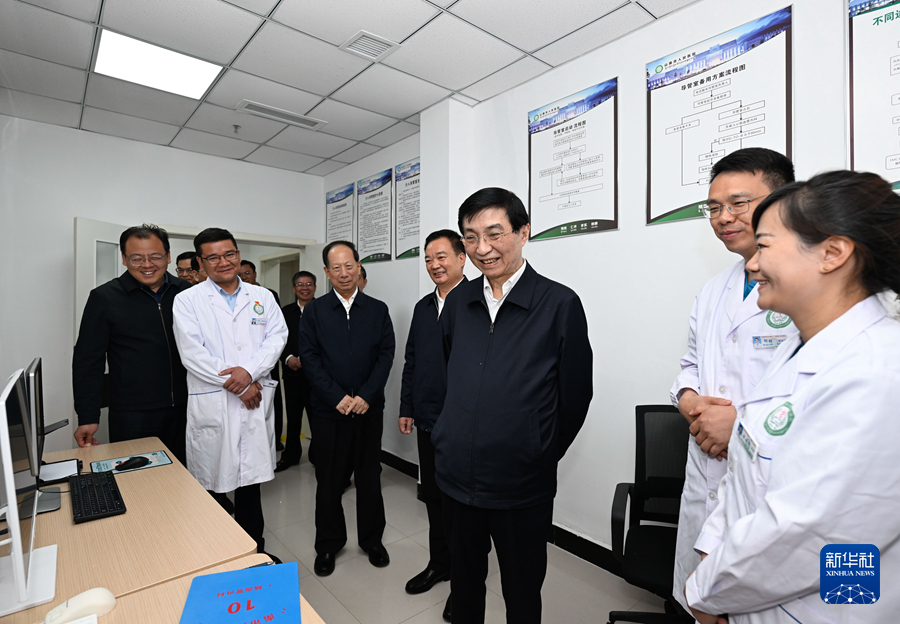 中共中央政治局常委、全國政協主席王滬寧到拉薩、山南就對口援藏等工作開展情況進行調研。這是8月27日,王滬寧在山南市人民醫院調研。新華社記者 申宏 攝