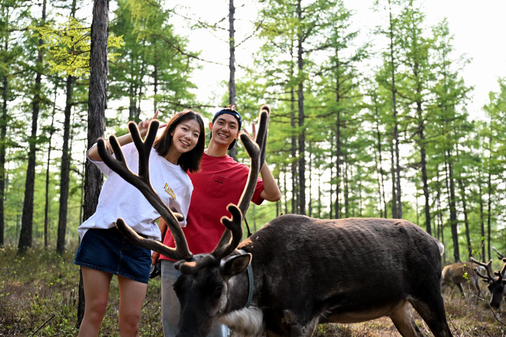 7月3日,游客在內蒙古呼倫貝爾市根河市阿尤莎馴鹿放養點游玩。