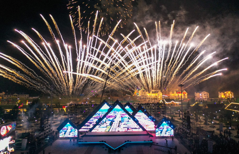在內蒙古興安盟阿爾山市拍攝的2023年中國(阿爾山)旅游大會開幕前一晚的焰火表演(2023年9月1日攝,無人機照片)。