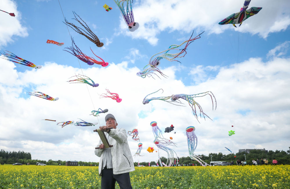 在遼寧省康平縣,一名風箏愛好者在風箏節活動現場放風箏(5月31日攝)。