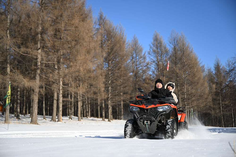 游客在內蒙古興安盟阿爾山市駕駛雪地摩托游玩(2023年12月14日攝)。