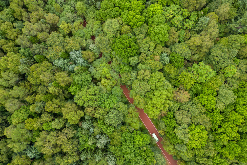 8月27日,游客乘坐電瓶車在黑龍江伊春市上甘嶺溪水國家森林公園內穿行(無人機照片)。