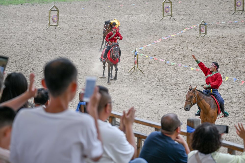 8月8日,游客在內蒙古興安盟科爾沁右翼前旗烏蘭毛都草原觀看馬術實景劇。