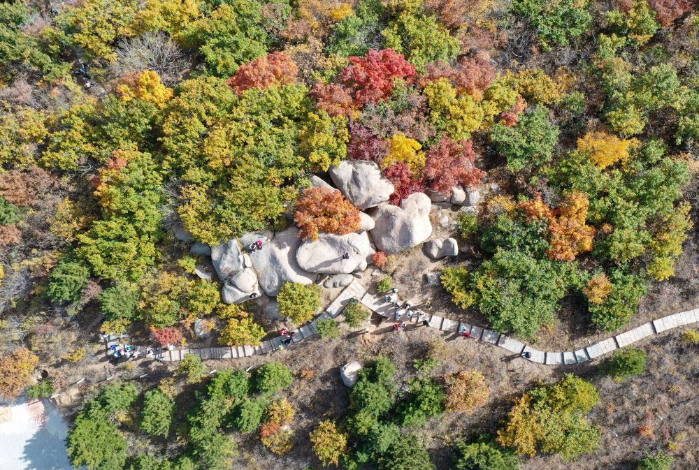 游客在遼寧阜新的海棠山游覽(2023年10月19日攝,無人機照片)。