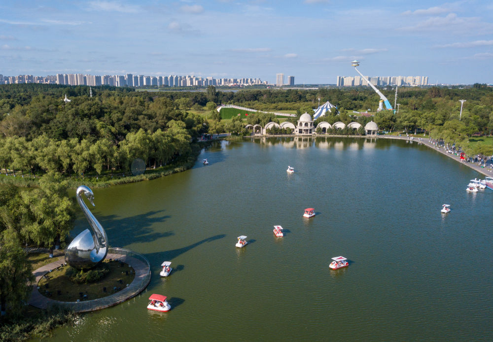 8月20日,游客在黑龍江哈爾濱太陽島風景區太陽湖上乘船游覽(無人機照片)。