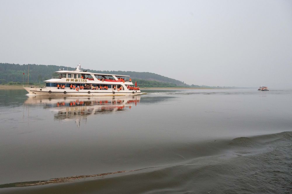 游客從黑龍江省漠河市北極村景區上船,乘船在黑龍江上觀光游玩(7月2日攝)。
