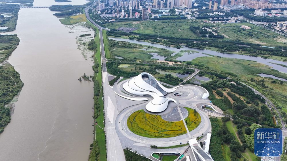 ↑這是哈爾濱大劇院臨江景色(8月20日攝,無人機照片)。