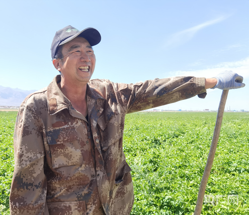 馬鈴薯種植基地管護人員高玉輝向記者介紹情況(央廣網記者 夏莎 攝)