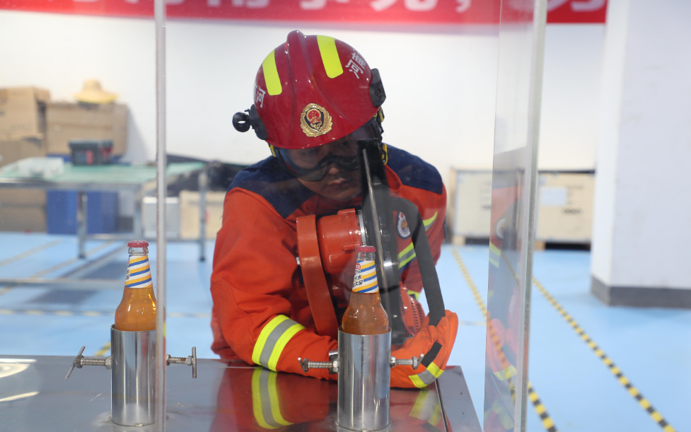 同樣掌握這手“絕活兒”的還有他的隊友王習(xí)武。在同一間訓(xùn)練室里,王習(xí)武端著15公斤的切割鋸來到事先擺好的玻璃瓶飲料前,用轉(zhuǎn)動的鋸齒連續(xù)掀開5個鐵瓶蓋,瓶身完好無損,瓶口無一絲刮痕。