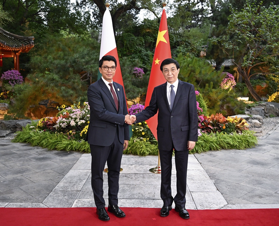 9月6日,全國政協(xié)主席王滬寧在北京會見來華出席中非合作論壇北京峰會的馬達加斯加總統(tǒng)拉喬利納。新華社記者 申宏 攝