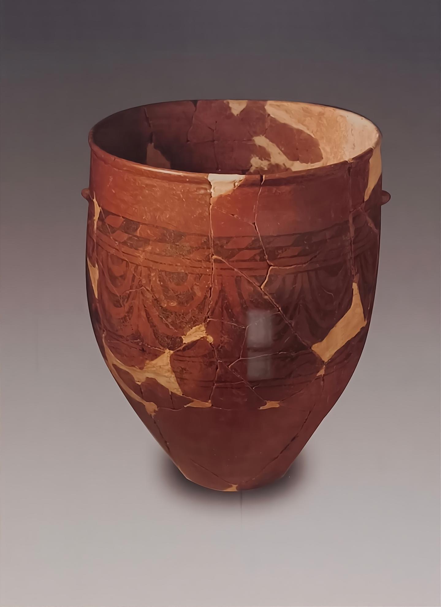 這件彩繪平底筒形罐最上面的菱形方格紋來自中亞地區,其下一片片的龍鱗紋是赤峰地區的本土元素,下方勾連狀的抽象玫瑰花圖案,則是仰韶文化的元素,體現了5500年前三種文化在草原深處碰撞出的文明火花。