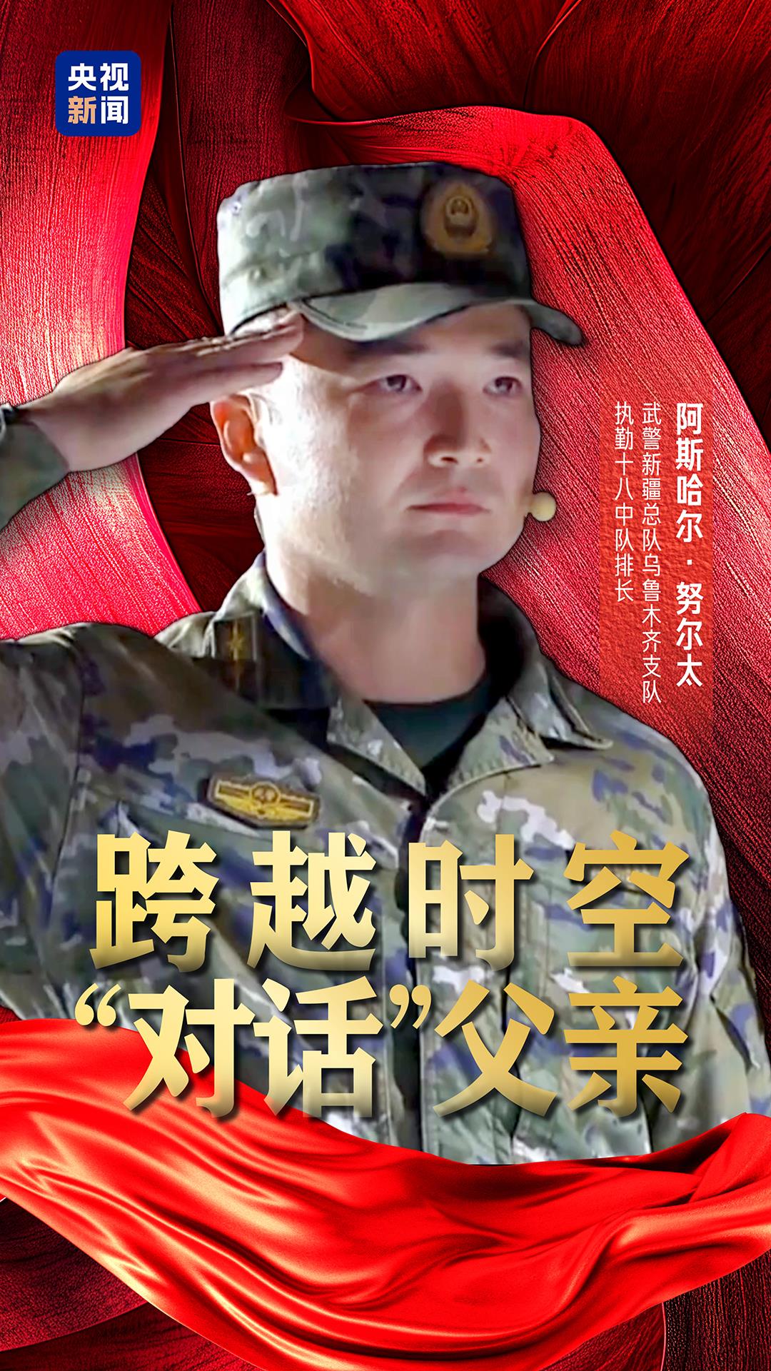 21日晚《把青春華章寫在祖國大地上》大思政課網絡主題活動現場,投筆從戎的南開學子阿斯哈爾 · 努爾太,通過AI技術穿越時空與父親對話。阿斯哈爾獻給父親的一個軍禮,令無數人動容。