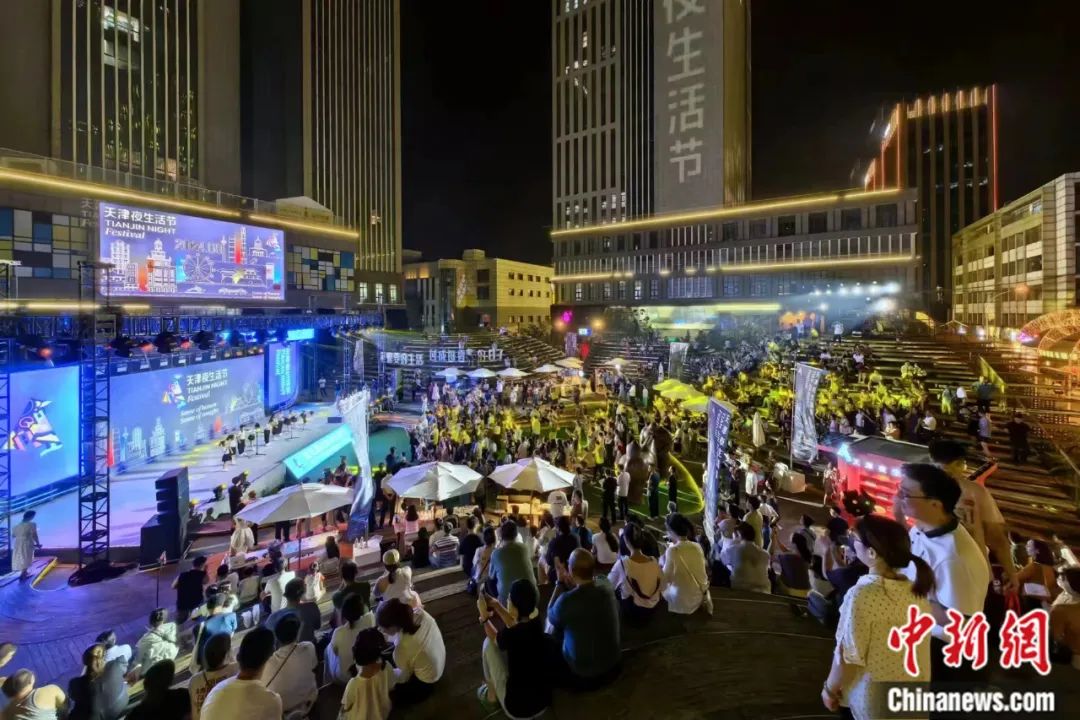 8月2日晚,由天津市商務局、天津市文化和旅游局、天津市體育局共同主辦的第五屆天津夜生活節啟幕。圖為民眾在啟動儀式上觀看文藝演出。中新社記者 佟郁 攝