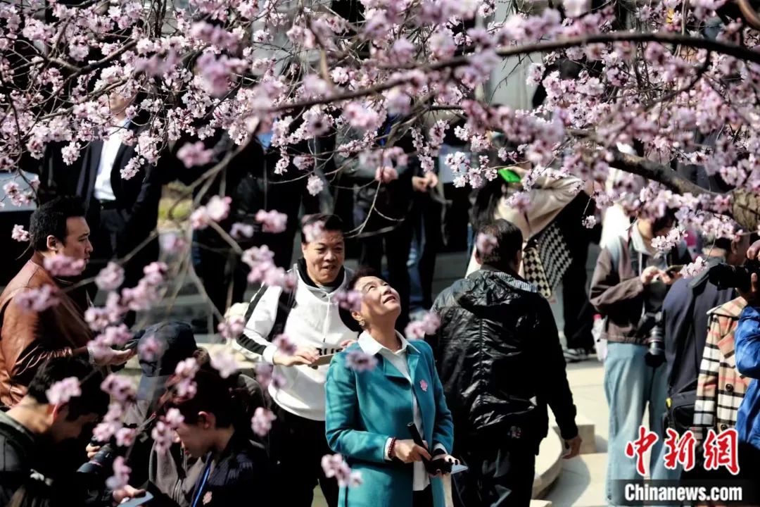 3月15日,民眾在天津北運河畔的桃花堤,賞桃花美景,品味運河文化。中新社記者 佟郁 攝