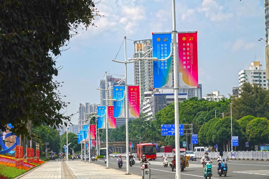 行走在南寧街頭,可見各式東博會和峰會的元素。今年的盛會以“親誠惠容同發展,鑲鉆成冠創未來”為主題,會期持續至28日,展覽規模近20萬平方米,參展企業超3000家。
