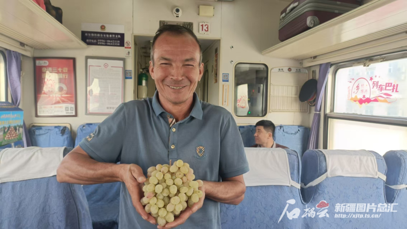 正是豐收時(shí)節(jié)。硬座車廂內(nèi),來自南疆地區(qū)乃至五湖四海的乘客們?cè)谧簧险勑︼L(fēng)生,小桌板上、行李架上放著裝滿核桃、無花果醬、大紅石榴的袋子和紙箱。