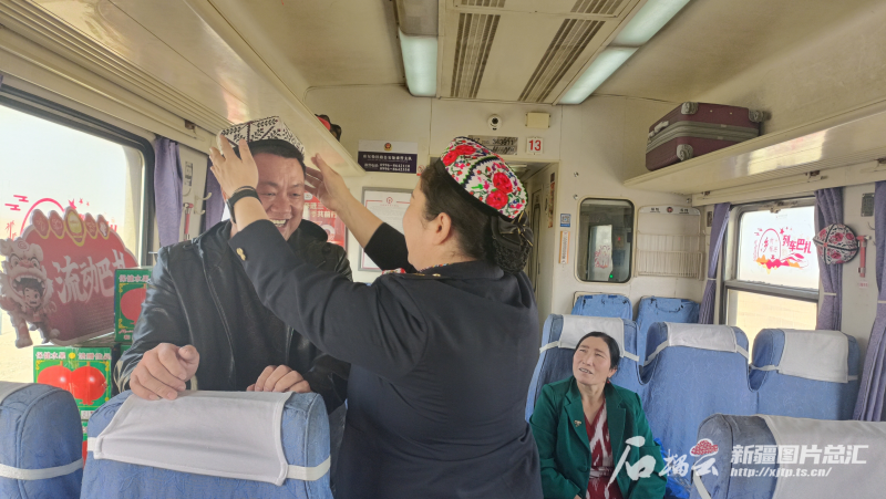 9月23日,7558次列車巴扎上,列車員瑪依然·賽買提給來新疆旅游的乘客戴上了一頂小花帽。石榴云/新疆日?qǐng)?bào)記者 宋衛(wèi)國攝
