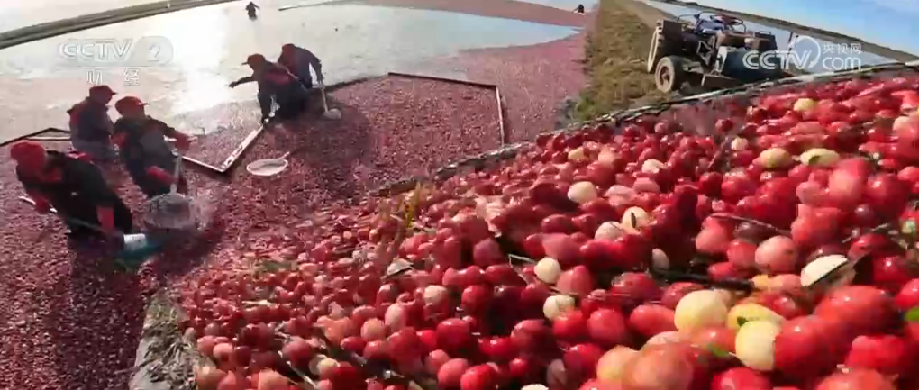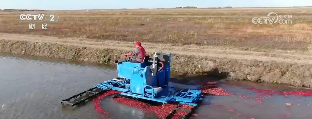 成熟的蔓越莓怎么收獲呢?轉過來看這里,這就是記者所說蔓越莓的地塊為什么像池塘,因為這里灌進水,工作人員就駕駛著采收機就可以收獲了,采收機上有兩排鋼條,它能將水里的蔓越莓從植株上脫落下來。因為蔓越莓里面是空心的,所以能夠浮在水面上。我們看,采收機走過之后,后面的蔓越莓就漂上來了。工作人員只需要來回多次的行駛,就可以把成熟的果子都收獲下來,這種方式收獲率可以達到97%以上。每個地塊都這么大,飄在水上的蔓越莓怎么才能收回來呢?工作人員在水里用木板把這些蔓越莓聚攏到一起,再通過提升機就可以裝到車廂里了。每到蔓越莓收獲的季節,田里就變成了紅色的海洋,非常漂亮。