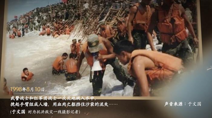 武警戰士和紅軍團戰士一次次地跳入水中挽起手臂組成人墻,用血肉之軀擋住沙袋的流失……