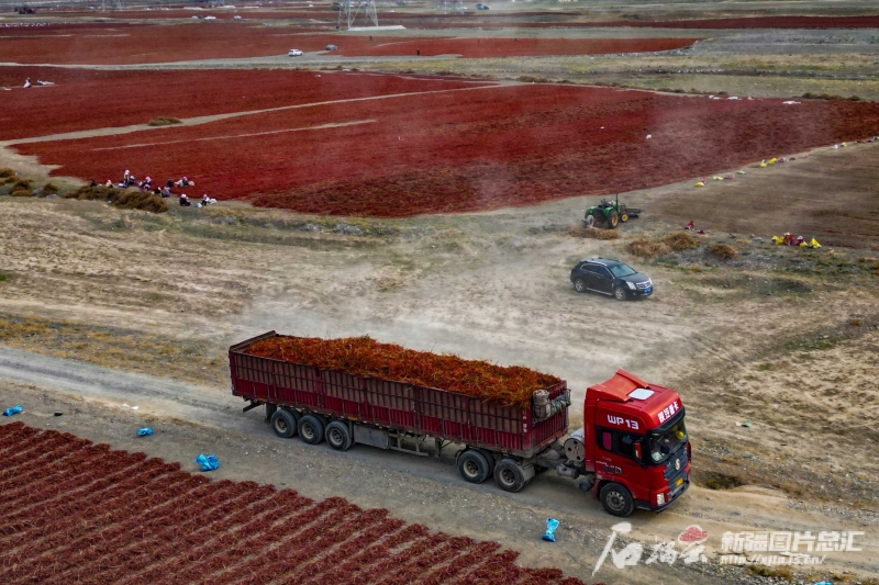 10月3日,貨運汽車在沙灣市安集海鎮萬畝天然曬場轉運辣椒(無人機攝)。