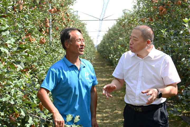 延安市洛川縣槐柏鎮(zhèn)黨委書(shū)記解賀宏(右)在果園與果農(nóng)交流(2024年8月5日攝)。新華社記者 鄒競(jìng)一 攝