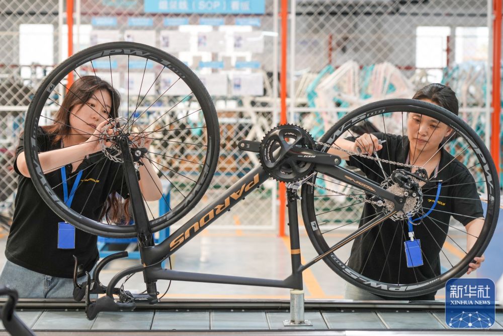 2024年7月8日,在山東泰山瑞豹復合材料有限公司生產車間,工人在組裝碳纖維自行車。位于山東樂陵經濟開發區的泰山體育產業集團為2024巴黎奧運會的摔跤、自行車、跆拳道、體操、田徑等比賽提供器材。新華社記者 朱崢攝