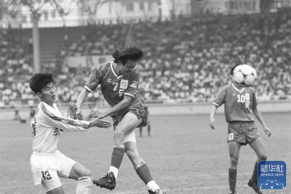 1994是中國足球職業化改革元年。這是1994年4月17日,全國足球甲級聯賽全面拉開戰幕。廣東宏遠俱樂部隊主場0比2負于北京國安俱樂部隊,這是國安隊7號謝峰(中)在頭球攻門。 新華社記者 劉彥武攝