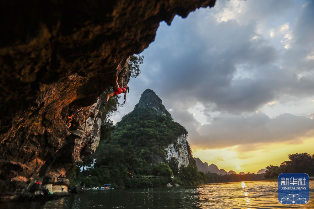 2023年9月5日,攀巖愛好者在廣西桂林市陽朔縣進行深水抱石。新華社記者 胡星宇 攝