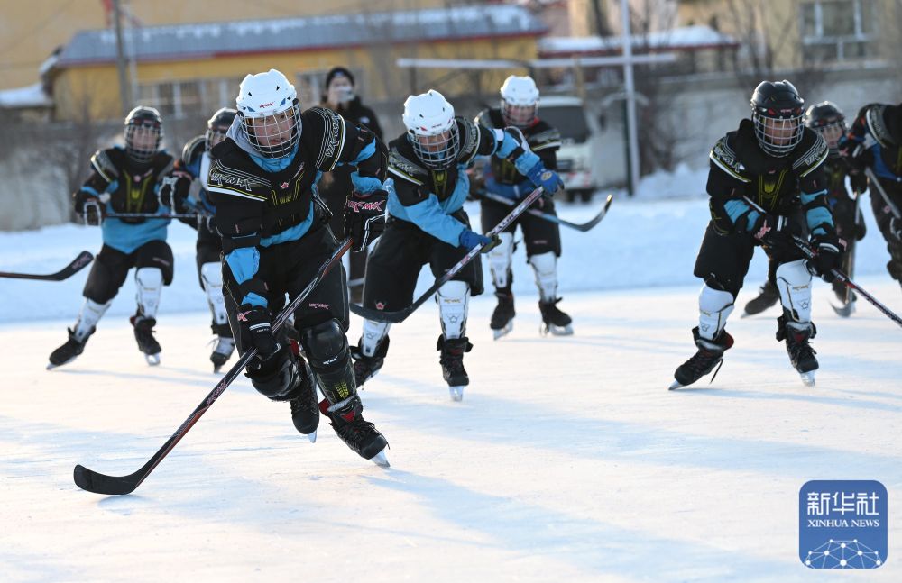 烏魯木齊縣水西溝中學冰球隊在訓練(2023年12月20日攝)。 新華社記者 李賀 攝