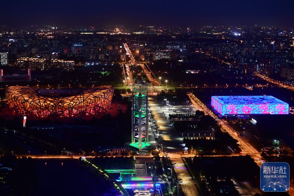 這是2022年6月23日拍攝的國家體育場(左)與國家游泳中心夜景。作為“雙奧之城”的標志性場館群“冰絲帶”、“鳥巢”、“冰立方”聯動亮燈,共同傳遞奧林匹克精神,號召民眾用運動點亮健康生活,創造美好未來。 新華社記者 張晨霖 攝