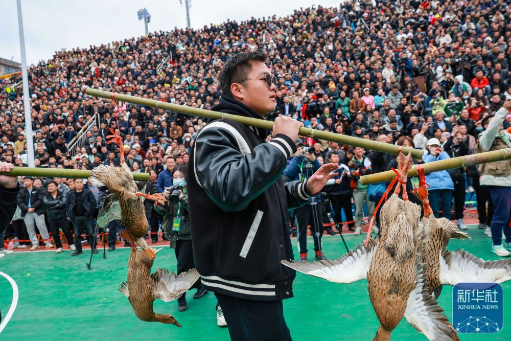 2023年3月27日,村民挑著當地農特產品“三穗麻鴨”進入賽場。這是季軍銅仁市代表隊的獎品。 當日,貴州省首屆“美麗鄉村”籃球聯賽總決賽在黔東南州臺江縣臺盤村舉行。新華社記者 歐東衢 攝