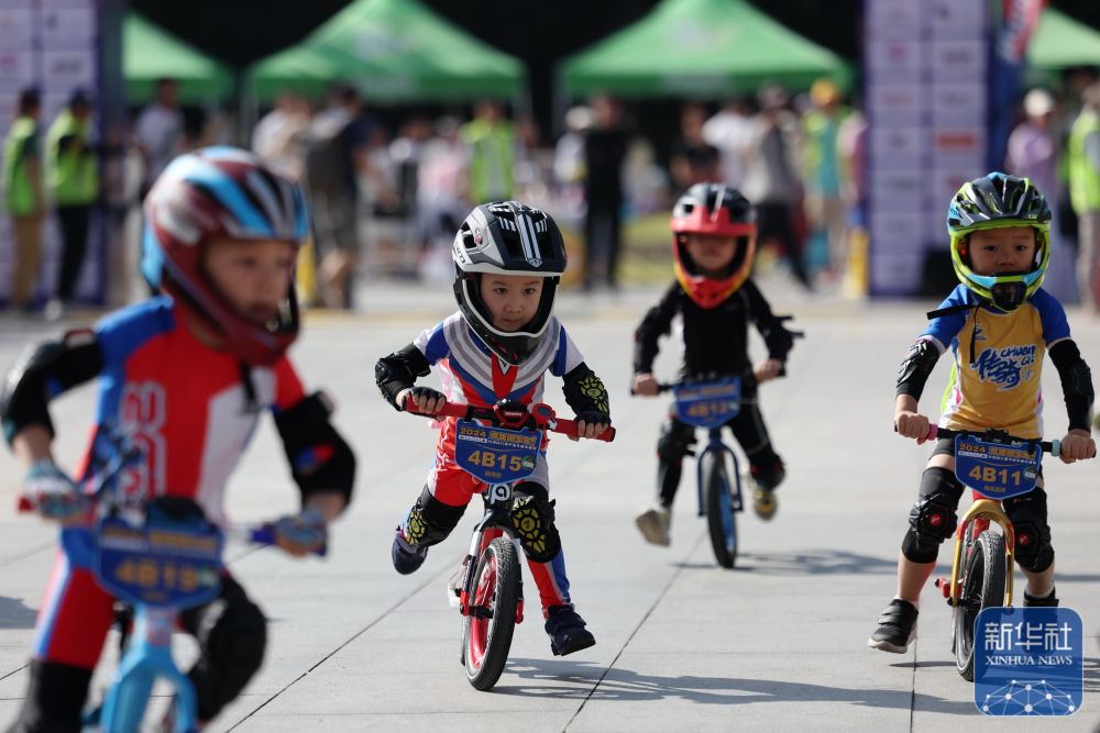2024年6月22日小選手寒博赟(左二)在比賽中騎行。當日,2024甘肅省兒童平衡車童車聯賽在甘肅省蘭州市甘肅大劇院廣場開賽。新華社記者 陳斌 攝
