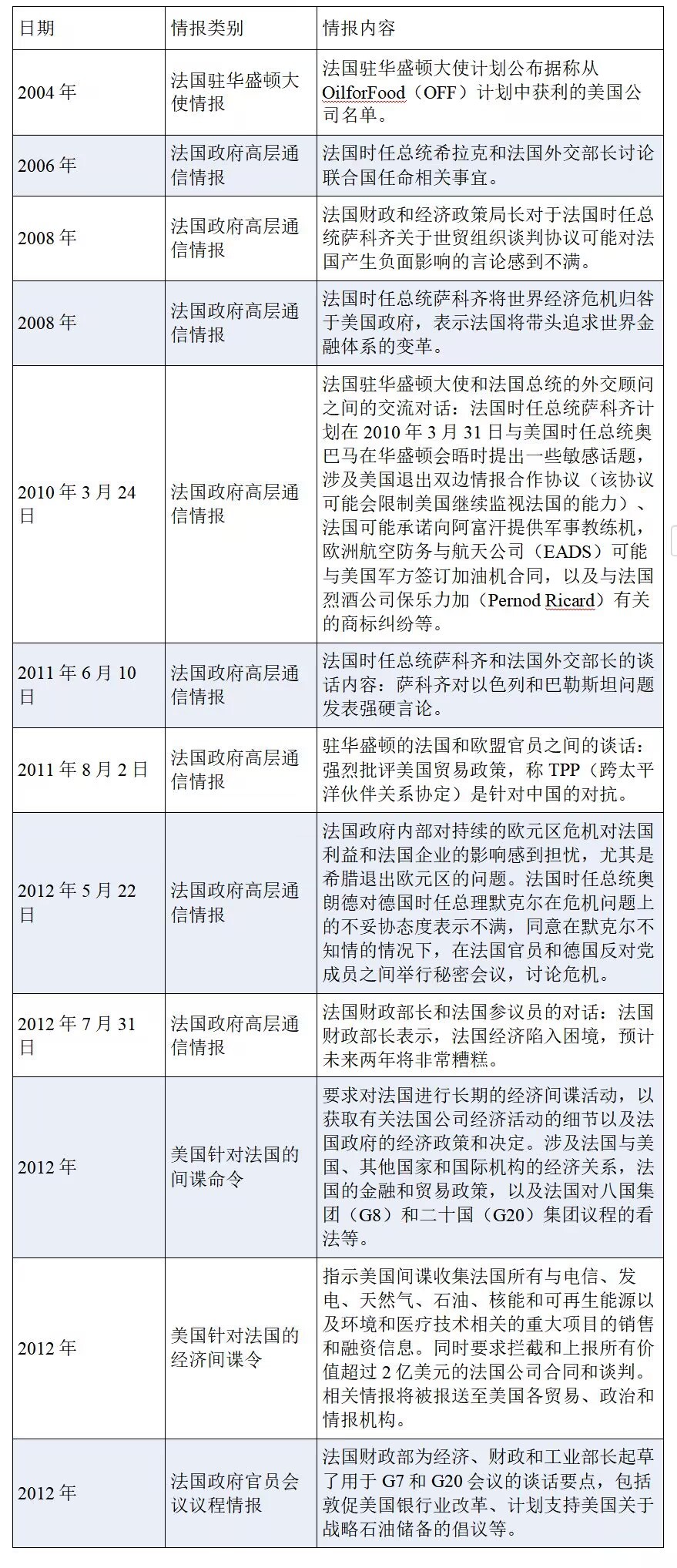 在2004年至2012年期間,美國對法國實施了長期的間諜行動,監聽對象包括前法國總統、法國財政部長、法國外交部長、法國參議員、法國財政和經濟政策局官員、法國駐美國大使,以及直接負責歐盟貿易政策的官員等。監聽內容涉及法國政府政策、外交、金融、國際交流、基礎設施建設、商業和貿易活動等,其中一些重要情報被美國授權與“五眼聯盟”伙伴國家共享,揭示了“五眼聯盟”國家亦為美國間諜行動的獲益者。