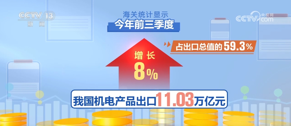 海關(guān)統(tǒng)計(jì)顯示,今年前三季度,我國(guó)出口產(chǎn)品結(jié)構(gòu)優(yōu)化,高端裝備出口增長(zhǎng)超4成。機(jī)電產(chǎn)品出口11.03萬(wàn)億元,增長(zhǎng)8%,占出口總值的59.3%。其中,高端裝備出口增長(zhǎng)43.4%,集成電路、汽車(chē)、家用電器出口分別增長(zhǎng)22%、22.5%、15.5%。此外,傳統(tǒng)勞動(dòng)密集型產(chǎn)品出口3.13萬(wàn)億元,增長(zhǎng)2.8%。