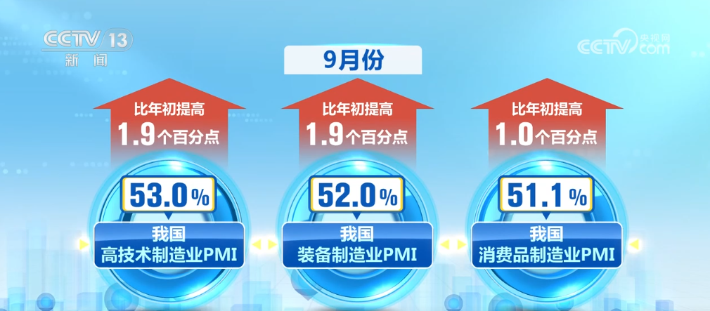 9月份,我國高技術制造業、裝備制造業和消費品制造業PMI分別為53.0%、52.0%、51.1%,比年初提高了1.9個、1.9個、1.0個百分點。相關行業處于擴張區間,景氣水平連續上升。