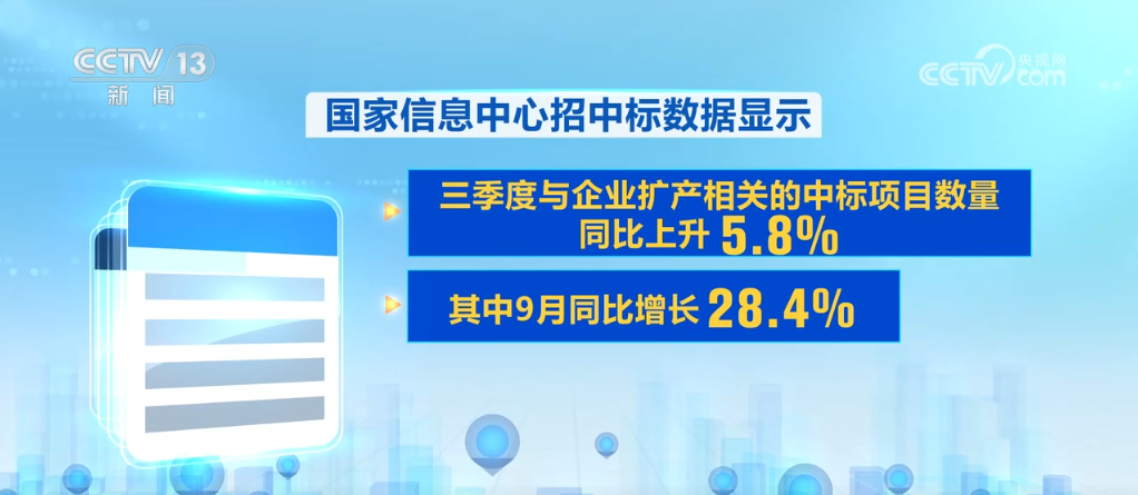 不僅工程建設在提速,作為項目落地的第一步,中標數據也在快速增長。國家信息中心招中標數據顯示,三季度與企業擴產相關的中標項目數量同比上升5.8%,其中9月同比增長28.4%,為今年以來最高增速,企業擴產熱度回升明顯。