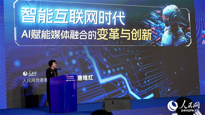 人民網監事會主席、研究院院長唐維紅發表題為《智能互聯網時代AI賦能媒體融合的變革與創新》的主題報告。人民網記者 吳茜薇攝