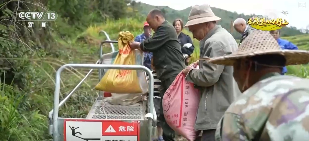 在景寧縣沙灣鎮葉橋村的高山梯田上,村民們正忙著將成熟的稻谷收割、脫粒,裝袋后通過軌道車運至山下,山野上下一派豐收的繁忙景象。而十多年前,這里因水源缺乏、外出務工人員增多,曾是一片撂荒地。