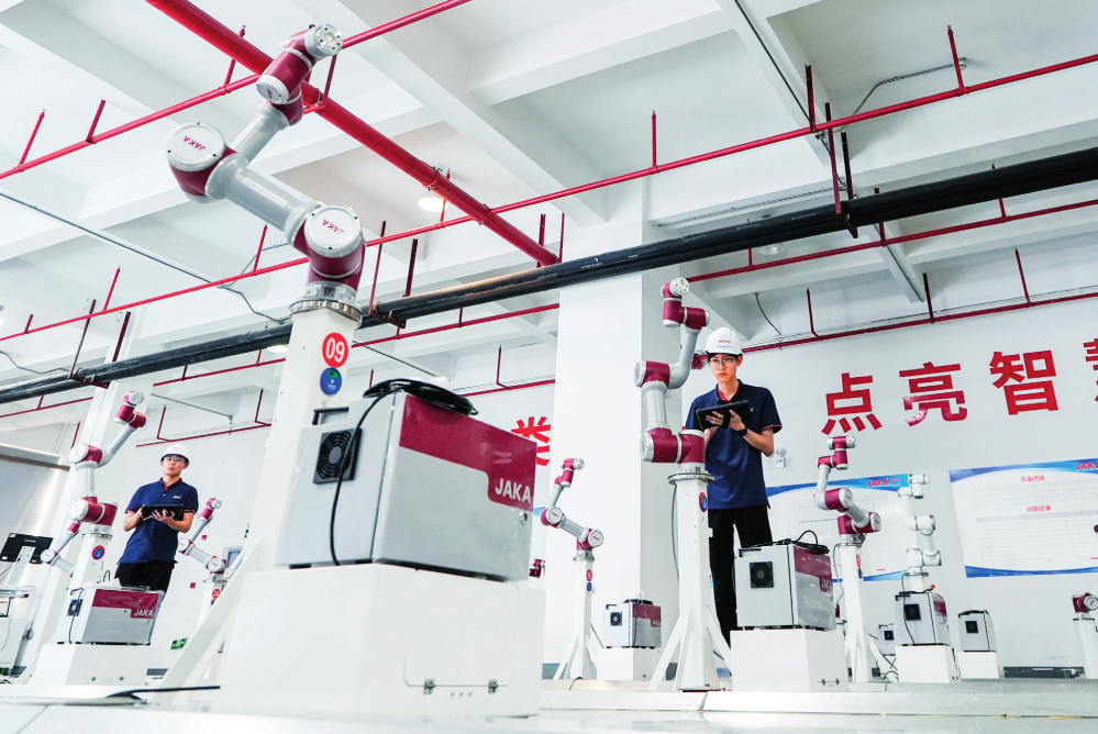在位于江蘇省常州市武進區的常州節卡智能裝備有限公司制造基地,工作人員在對柔性智能協作機器人進行全系列測試(2024 年 6 月 14 日攝) 李博攝 / 本刊