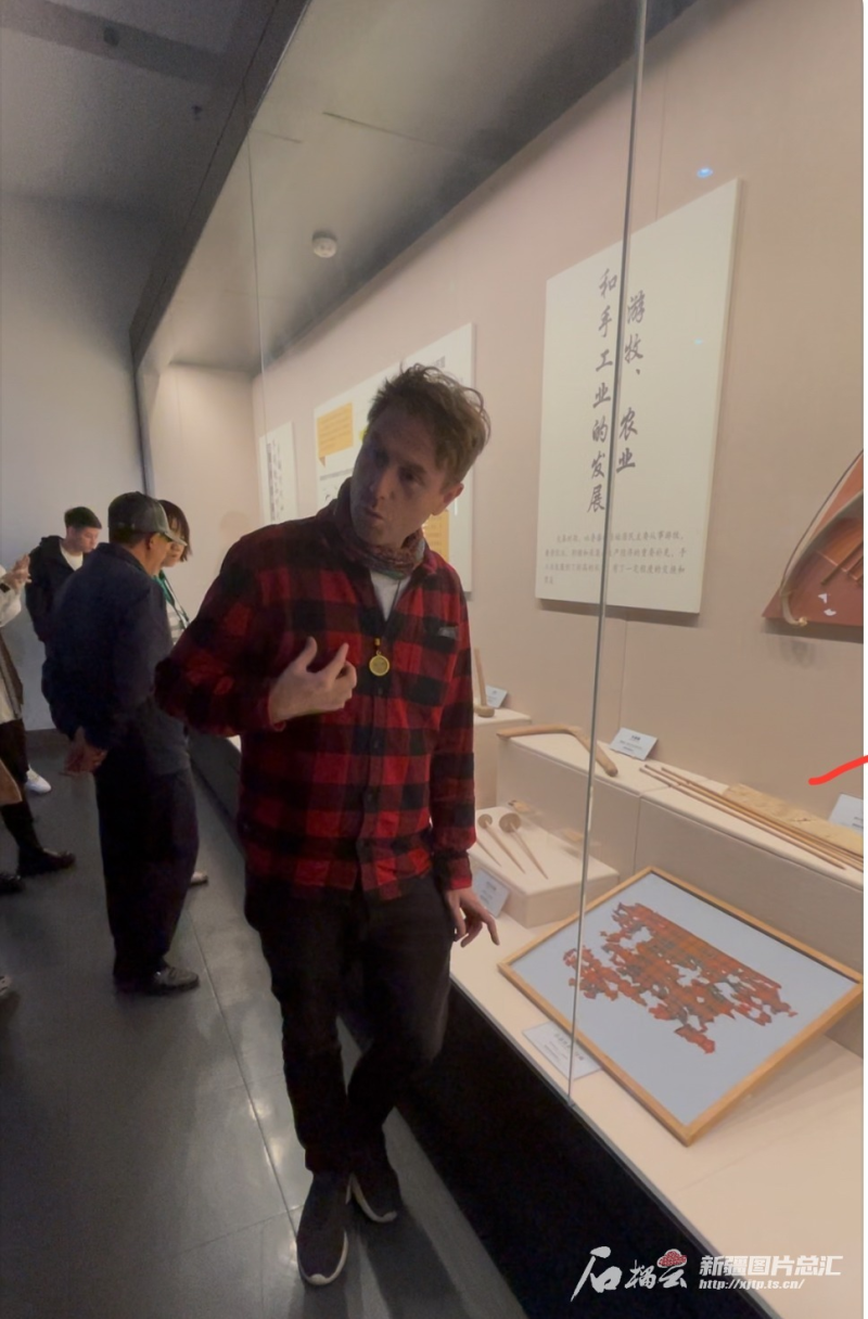 “你們看,這件文物的花紋,跟我的襯衫花紋一樣,古人也很時尚啊!”10月20日,參加“中國有約·相約新疆”2024國際媒體采訪活動的自媒體創作者——來自英國的托比在吐魯番博物館參觀時,指著展示柜的一件文物興奮地說。
