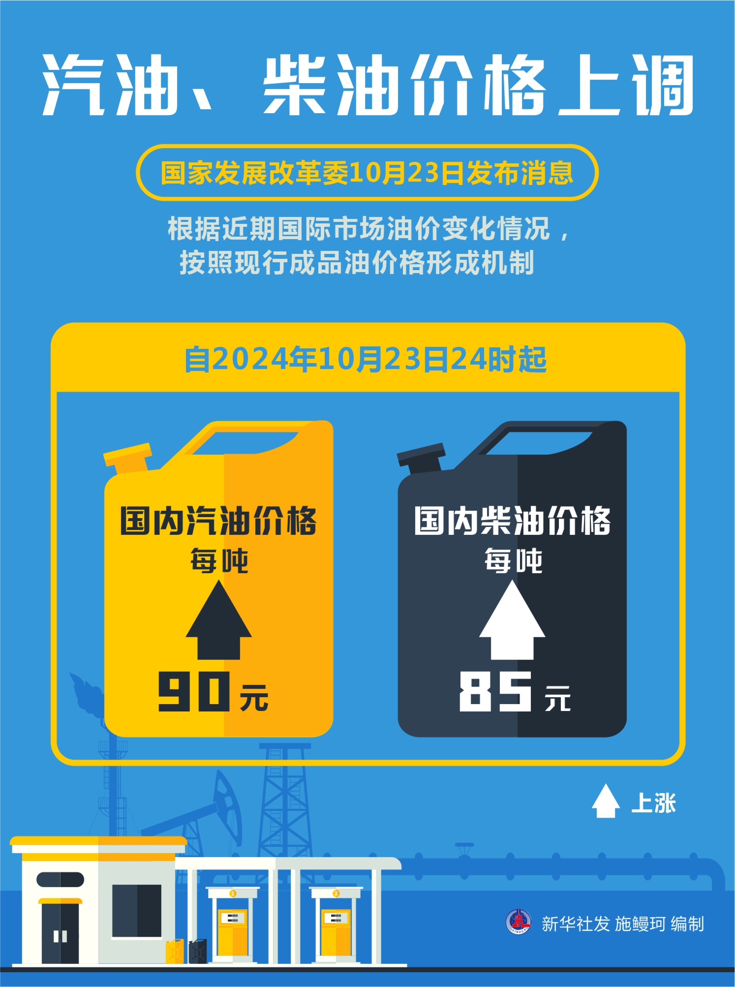 國家發展改革委23日發布消息,根據近期國際市場油價變化情況,按照現行成品油價格形成機制,自2024年10月23日24時起,國內汽、柴油價格每噸分別上漲90元和85元。