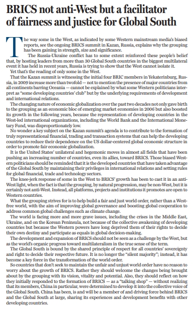 原標題:BRICS not anti-West but a facilitator of fairness and justice for Global South