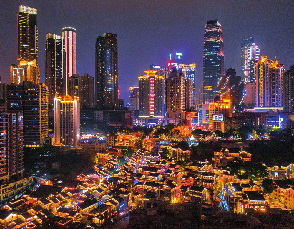 重慶市渝中區(qū)十八梯傳統(tǒng)風(fēng)貌區(qū)和遠處高樓林立的解放碑 CBD 夜景(2023 年 2 月 10 日攝)黃偉攝 / 本刊