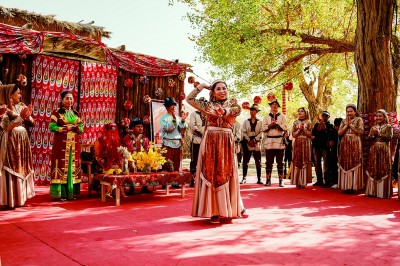 村子里,許多高齡老人依舊耳聰目明,豁達豪放,和著古老的旋律翩然而舞。“我從塔里木河走來,牛羊遍地,魚兒歡暢,姑娘,我多想到你的身旁……”古老的羅布淖爾民歌傳唱至今。今天的羅布人村寨,據(jù)傳是從羅布泊遷徙而來。村寨內(nèi)的特色婚房前,來自五湖四海的游客身著民族服飾,在迎親、跨火盆等熱鬧喜慶的儀式中,沉浸式感受當(dāng)?shù)氐膫鹘y(tǒng)婚俗。