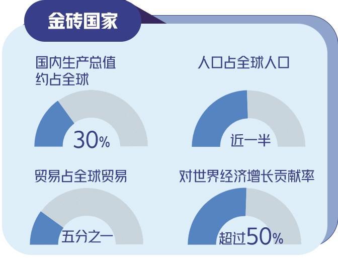 今年是“大金磚合作”開局之年。擴員后,金磚國家國內生產總值約占全球30%、人口占全球人口近一半、貿易占全球貿易五分之一,金磚成色更足、分量更重、潛能更大。