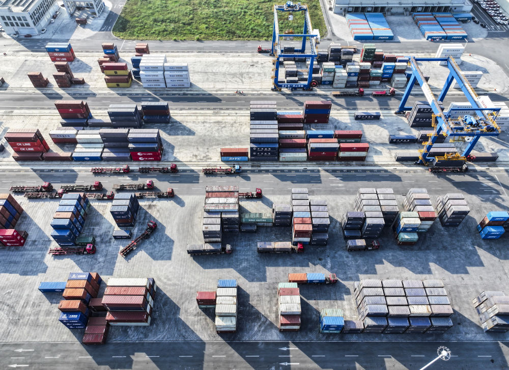 10月28日,轉運卡車在陸海新通道重慶無水港來往穿梭(無人機照片)。